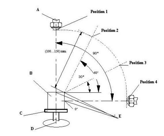 高壓水泵→三通→噴嘴和平衡壓力出口→電磁流量計(壓力表,100bar)→分四路(分別由電磁閥控制,電磁閥通過設定時間→由控制器控制)→以30度的角度遞進(四個高壓噴嘴:0,30,60和90度),在每個角度持續30秒,共120秒(2分鐘),循環工作。