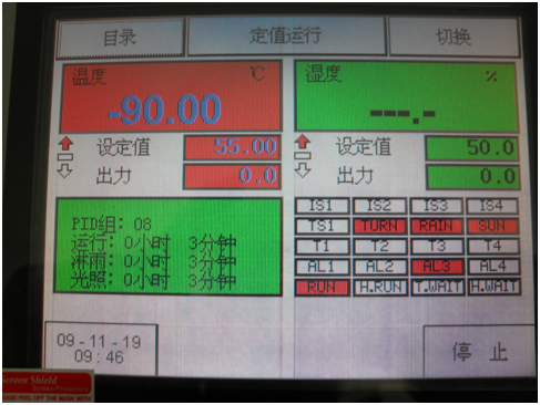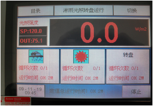 本公司自行研發的智能輻照測量調節系統,包括16位真彩觸摸屏控制顯示界面和北京師大光電生產的輻照測量傳感系統及專用光纖,顯示界面如下: