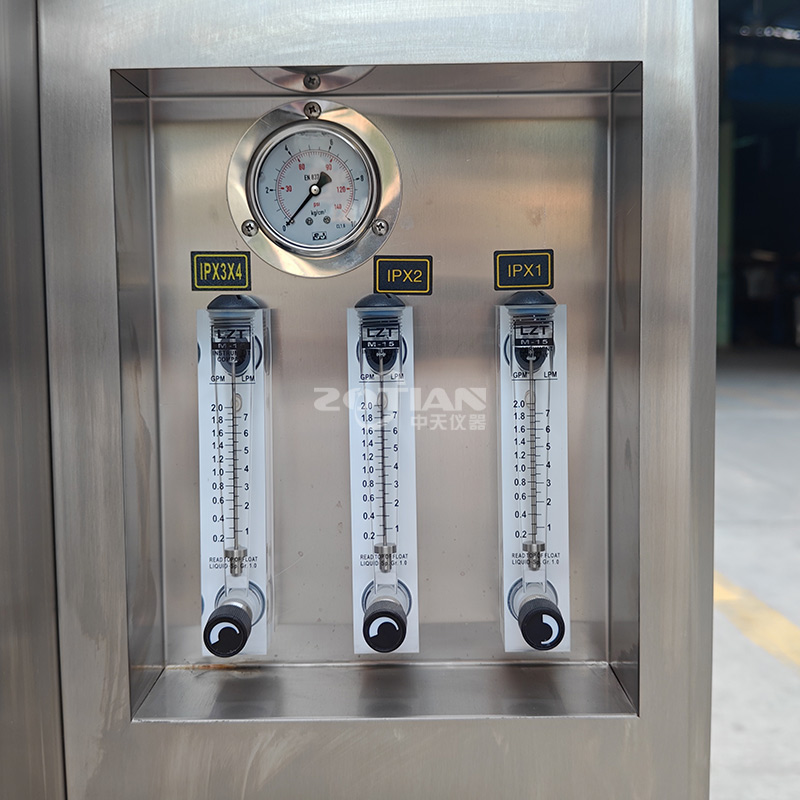 防雨密封性試驗裝置要保證從側面和頂部方向對產品噴水,避免出現噴水死角,保證噴水壓力、流量對應于產品位達到國標要求。淋雨框架結構在保證防銹,防震的同時做到簡潔美觀,整個設備操作簡單,便于零部件的檢修和維護。